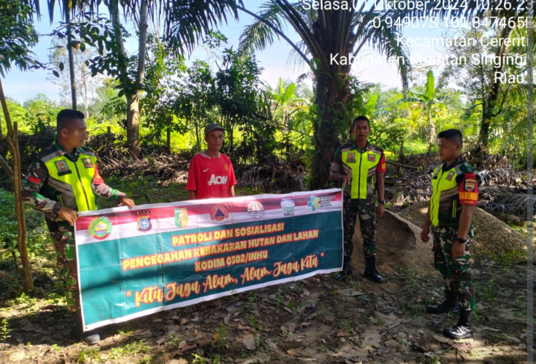 Kuantan Singingi,Mediamutiara.com Babinsa Koramil 06/Cerenti kodim 0302/Inhu Pratu Teguh Mulya bersama Rekan – rekan melaksanakan kegiatan patroli dan sosialisasi pencegahan kebakaran hutan dan lahan (Karhutla) di wilayah Desa Pulau Jambu Kecamatan Cerenti, Kabupaten Kuantan Singingi. Selasa (1/10/2024).