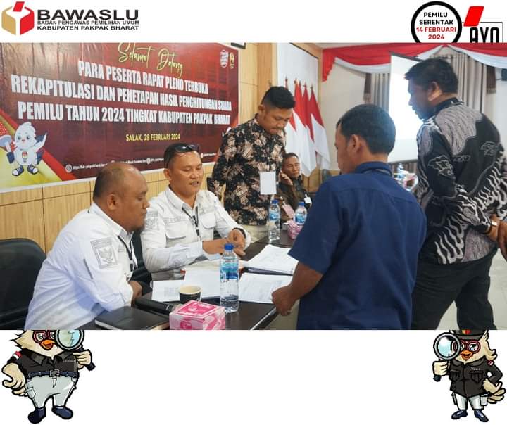 Pakpak Bharat – MediaMutiara – Ketua dan Anggota Bawaslu Pakpak Bharat beserta jajaran sekretariat melakukan pengawasan pada penyelenggaraan Rapat Pleno Terbuka Perolehan Suara Pemilu 2024 yang berlangsung di aula Bale Sada Arih Panorama Indah Sindeka Salak pada Kamis 29/02/2024.