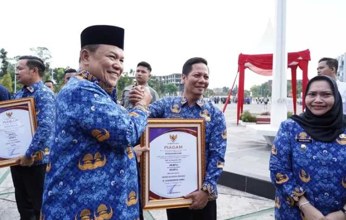 Bupati Kuansing, Dr. H. Suhardiman Amby, dianugerahi Penghargaan Universal Health Coverage (UHC) Prioritas oleh Plt Gubernur Riau, SF Hariyanto, pada puncak peringatan Hari Kesehatan Nasional (HKN) yang digelar di Halaman Kantor Gubernur Riau, Pekanbaru.