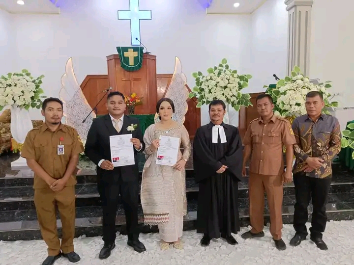 Terlihat Petugas Dukcapil yang bertugas di Kecamatan Sitinjo Poman Lumban Gaol bersama Kepala Desa Sitinjo yang diwakili Kasi Pemerintahan Diesy Cristianto, Kasi Kesejahteraan Marihot Lumbantoruan, Kadus 1 Payung Raja Junar Kudadiri menyerahkan akta pernikahan di Gereja HKBP Eben Ezer Sitinjo.