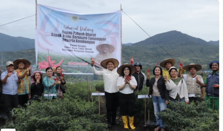 Bupati Pakpak Bharat, Franc Bernhard Tumanggor memetik cabai merah dalam “Panen Raya Cabai Merah Serentak” di Kawasan Pertanian Terpadu (KPT) desa Silima Kuta, kecamatan Sitellu Tali Urang Julu.
