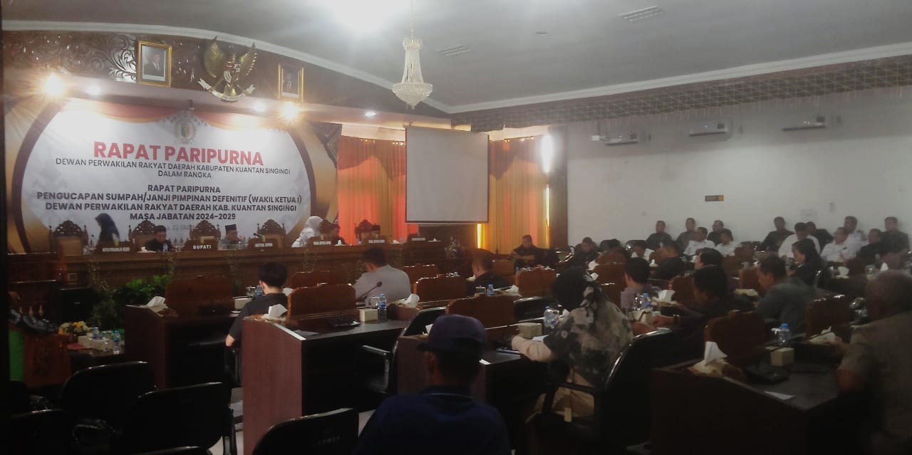 Kuansing (MediaMutiara) – DPRD Kabupaten Kuantan Singingi menggelar rapat Paripurna, dengan agenda penyampaian pidato pengantar RAPBD Kuansing 2025 ini dipimpin langsung Ketua DPRD, Juprizal dan didampingi Waka II Romi Alfisah Putra serta dihadiri anggota DPRD, Forkopimda, dan undangan lainnya. Rabu (23/10/2024).