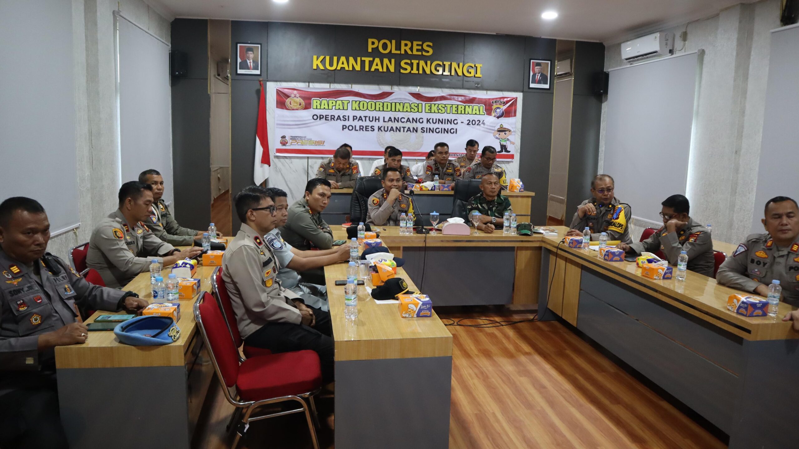 Kapolres Kuansing AKBP Pangucap Priyo Soegito, S.I.K.,M.H., membuka rapat dengan menyampaikan ucapan terima kasih kepada para tamu undangan yang hadir dalam rapat koordinasi eksternal Operasi Patuh Lancang Kuning 2024. Beliau menegaskan bahwa operasi ini akan dilaksanakan mulai tanggal 15 hingga 28 Juli 2024 selama 14 hari di seluruh wilayah Indonesia. Jenis operasi ini adalah operasi harkamtibmas bidang lalu lintas yang lebih mengedepankan kegiatan edukatif dan persuasif serta humanis, didukung dengan penegakan hukum lalu lintas secara elektronik, baik statis maupun mobile.