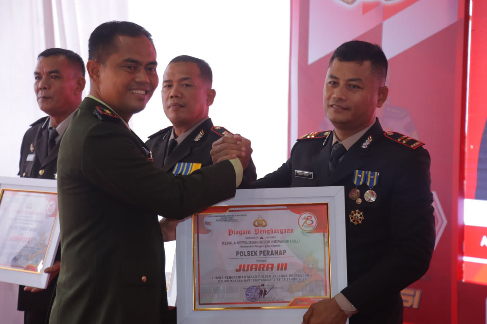 Selain itu, dalam rangkaian upacara tersebut, Kapolres memberikan penghargaan kepada beberapa personel perwakilan dari masing-masing satuan. Salah satu penghargaan tersebut diberikan kepada Kapolsek peranap Iptu Dodi Hajri, SH yang memimpin Polsek Peranap meraih Juara Tiga dalam penilaian Polsek terbaik dan Mako terbersih se-Polres Inhu Penghargaan ini diberikan sebagai apresiasi atas berbagai inovasi dan terobosan yang telah dilakukan di wilayah peranap terutama dalam hal deteksi dini, edukasi, dan kebersihan.