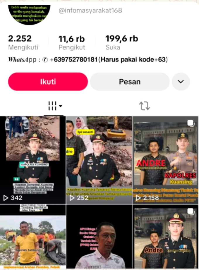 KUANTAN SINGINGI – Mediamutiara.com Praktik lancung di dunia maya kembali memakan korban. Kali ini, seorang pengusaha asal Petai, Kuantan Singingi, Andre Noveardo, resmi angkat bicara terkait tindakan intimidasi dan dugaan pemerasan yang dilakukan oleh akun anonim TikTok @Infomasyarakat168.