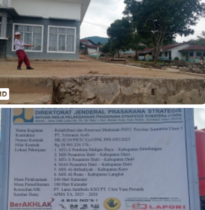 DAIRI – Mediamutiara.com Proyek Rehabilitasi dan Renovasi Madrasah PHTC Provinsi Sumatera Utara 5 di Kabupaten Dairi menuai polemik. Kegiatan konstruksi yang menelan anggaran miliaran rupiah ini diduga kuat mengabaikan standar Sistem Manajemen Keselamatan Konstruksi (SMKK), hingga mengancam keselamatan siswa sekolah dasar di lokasi sekitar.