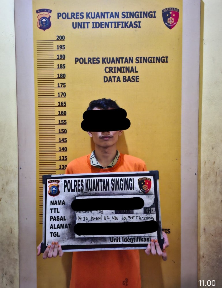 Kapolres Kuansing AKBP Pangucap Priyo Soegito, S.I.K, M.H, melalui Kasat Narkoba Polres Kuansing AKP Novris, menjelaskan “Tersangka yang berhasil ditangkap adalah seorang berinisial RR (21), yang diduga sebagai pengedar narkotika. Barang bukti yang diamankan dari tersangka meliputi 1 paket plastik klip yang diduga berisikan narkotika jenis Shabu, 1 kotak rokok merk Esse Double Change, 1 unit handphone merk Vivo warna biru, dan 1 unit sepeda motor merk Honda Scoopy,” jelas Kasat.