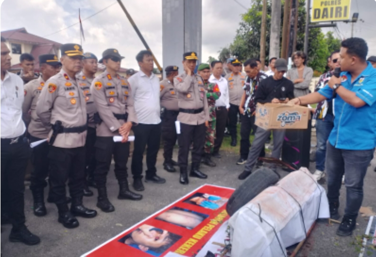 DAIRI – Mediamutiara. Com Suasana di depan Mapolres Dairi memanas. Gelombang kemarahan publik meledak lewat aksi besar-besaran yang digelar oleh Forum Peduli Penegakan Keadilan dan Hukum (FPPKH). Puluhan massa yang merupakan gabungan elemen pemuda dari KNPI, IPK, GMNI, HMI, PMII, IPNU, hingga Pemuda Muhammadiyah, turun ke jalan menuntut keadilan atas kasus pengeroyokan yang menimpa Iwan, putra dari Anggiat Bintang.